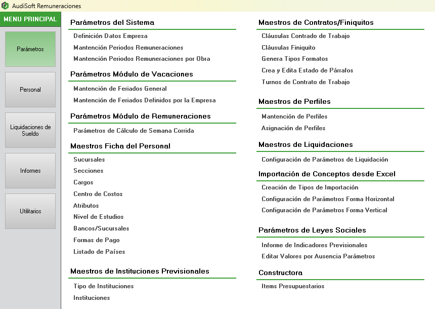 ¶ ParámetrosEn este menú se debe establecer los parámetros generales para el uso adecuado del sistema de remuneraciones. |