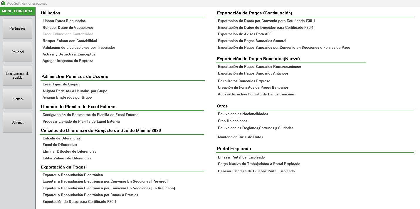 ¶ UtilitariosAquí encontrará algunas opciones que revisar el usos del sistema o utilidades para uso externo de la información. |
